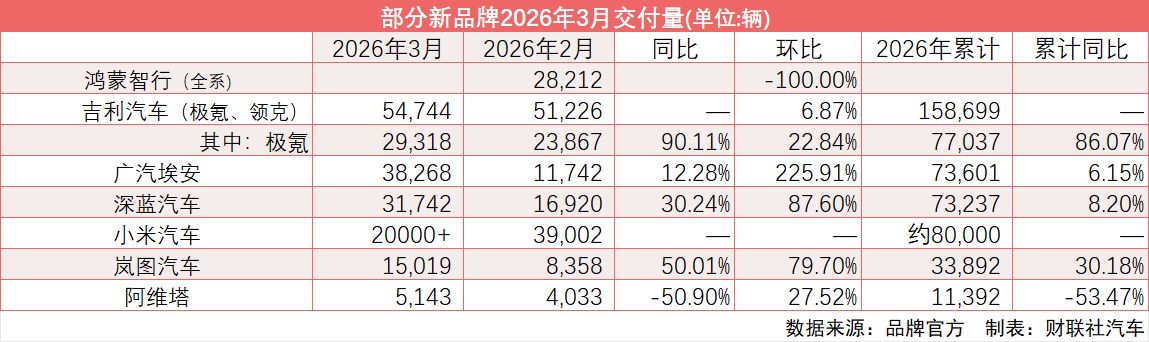 财联社4月2日讯(记者 张屹鹏)由传统车企孵化而生的造车“新品牌”,在开年阶段持续承压后,交出了2026年第一季度收官月成绩单。
