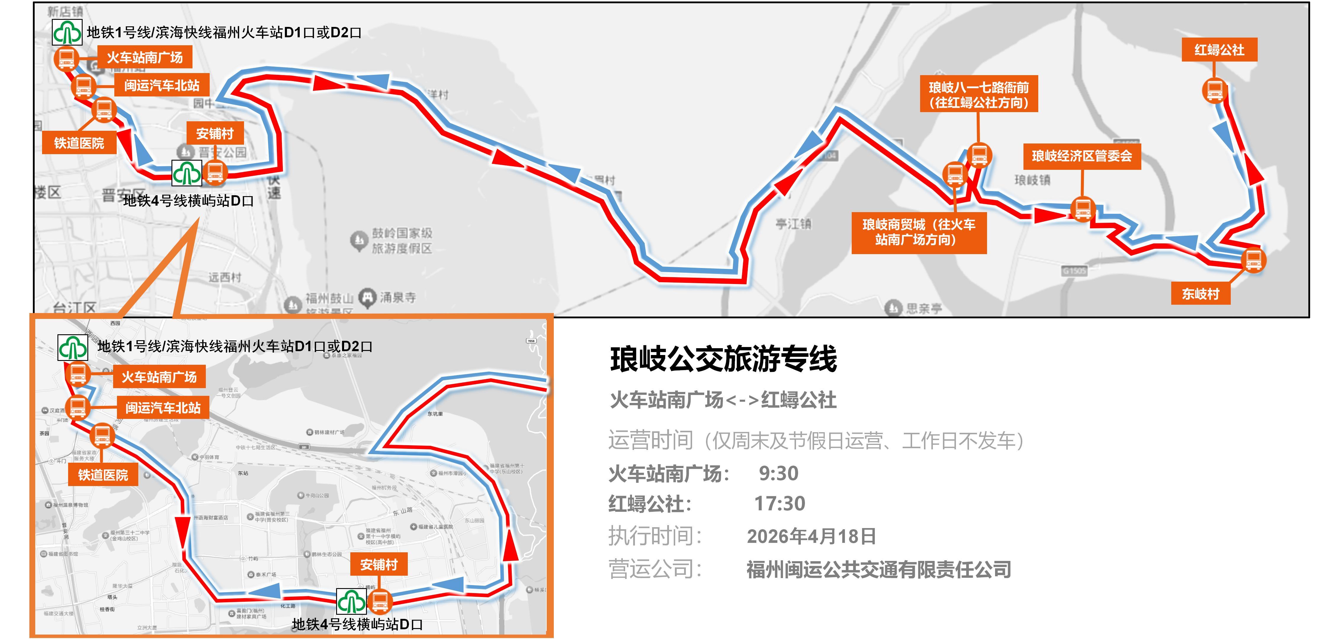 专线以火车站南广场与琅岐红蟳公社为起讫点,沿途串联琅岐八一七路衙前、琅岐商贸城、东岐村等,衔接市区交通枢纽、琅岐集镇腹地与核心景点。线路实行定时班次运营。同时,该专线可接驳地铁1号线/滨海快线福州火车站(步行距离约200米),也可接驳地铁4号线横屿站(步行距离约300米)。专线仅周末和节假日每日运营2趟次(工作日不发车),火车站南广场9:30、红蟳公社17:30发车。