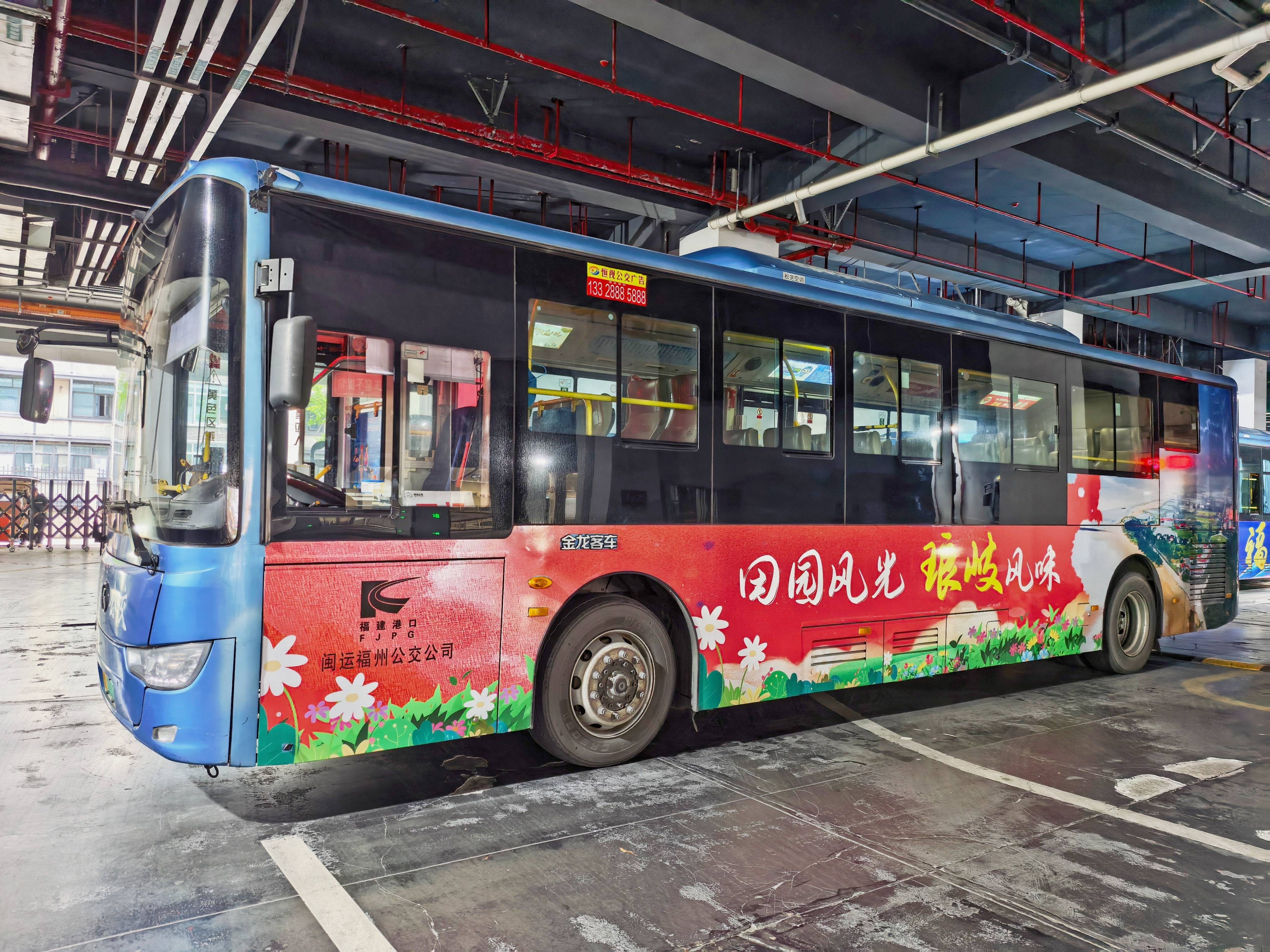 该专线车身设计以琅岐风光为元素,将红光湖、龙鼓度假村、红蟳公社等标志性景观进行车身涂装。